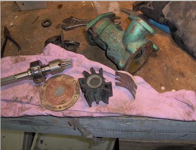 When I removed the heat exchanger from the engine I found two rubber wings from the impeller and - left - in the pump there was the impeller missing two wings!