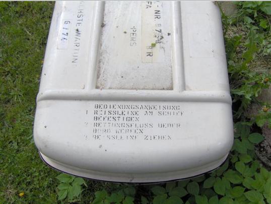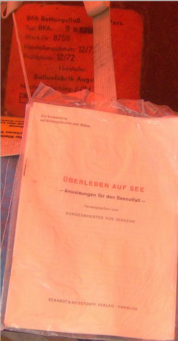 The raft was really in perfect condition. There where all kinds of gear inside it. Water, paddels, fireworks, fishing gear, flashlight, mirror etc. The inspection of a raft is mostly about checking the rafts air-fillsystem. Its a highpressure gasbottle that has to be tested and refilled. The raft itself should not leek to much air (or sea water). Batteries will be changed, fireworks etc etc.