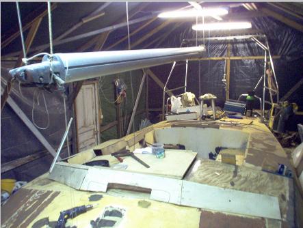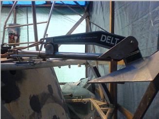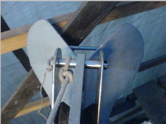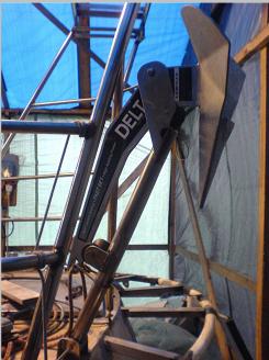 Windrudder (experimental) in place. To the right is the anchor "kranbalk" arm that will keep the anchor off the hull and outside the swimplatform aft. Visible is also the mechanical of the homemade servopendulum windrudder.