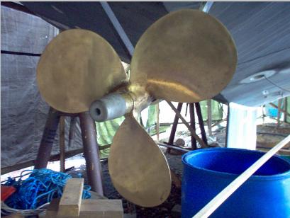 The new PSS seal mounted on shaft and pressure bearing inplace - needs paint. Propeller test mounted! Beauty - 50 cm diameter. It should surly give some amps during sailing.
