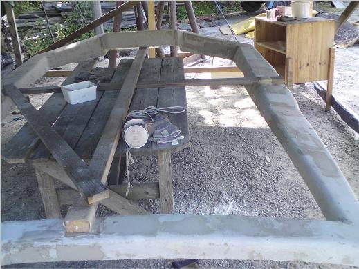 Cut up some teak ribs and mounted them on the frame. Unpacked the sails (last time where five years ago!) and looked for all the running rigg,