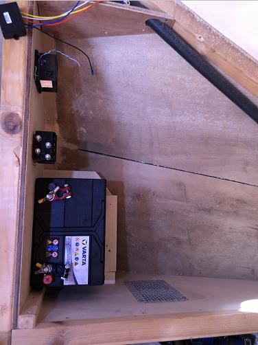 Remote control, heavy duty relay, DC-DC converter and battary 70 Ah (?) was mounted far aft under bunk.