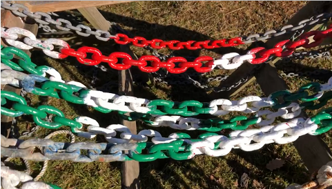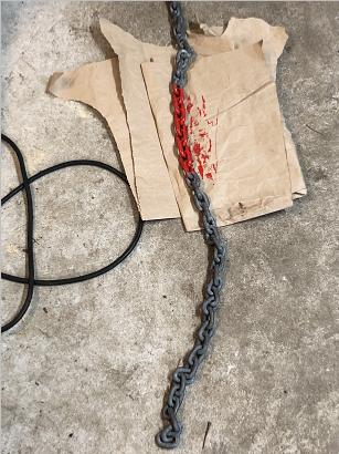 Anchors got a red back/neck so that they as easy to locate on the bottom. The chains got meter markings for every centimeter...joking. On the base color eg green there are 2 white marks for 20 meter, 3 white at 30 meter. More more precise not needed. At 50 meter on the main chain, 12 mm, is a long red mark with 1 white and at the chain end-start of line another red with 2 white - then 30 meter of unmarket line! Oh dear...