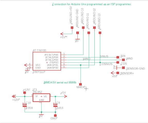 But I had a AT-Tiny85 - a 8 pin smart micro controller that would fit perfectly. So two analog values from wind direction and one digital pulse from wind speed s input and one pin for serial NMEA and 2 ping for power - I have 1 pin over :-). I 3D printed a mount bracket with room for the controller and sealed it good.